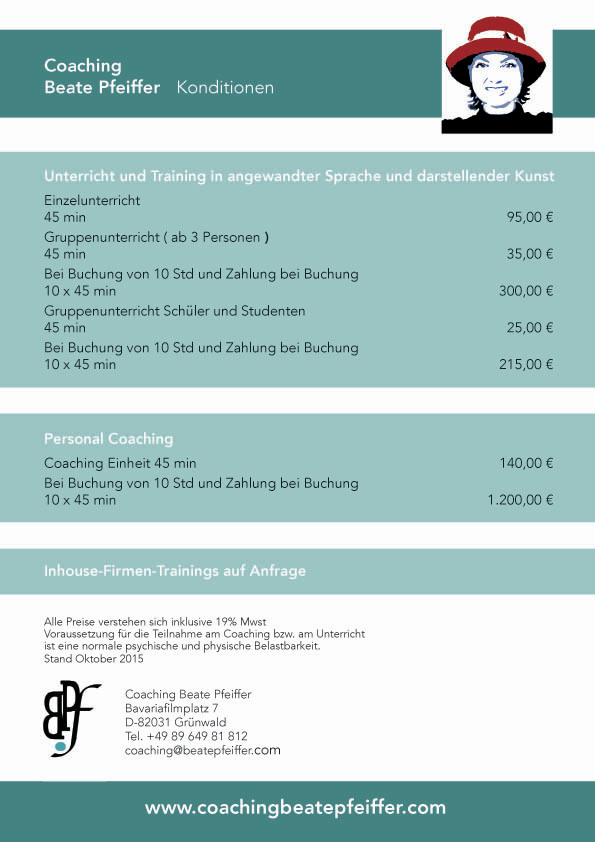 Coaching Beate Pfeiffer Bavariafilmplatz 7 / im Filmzentrum 82031 Grünwald